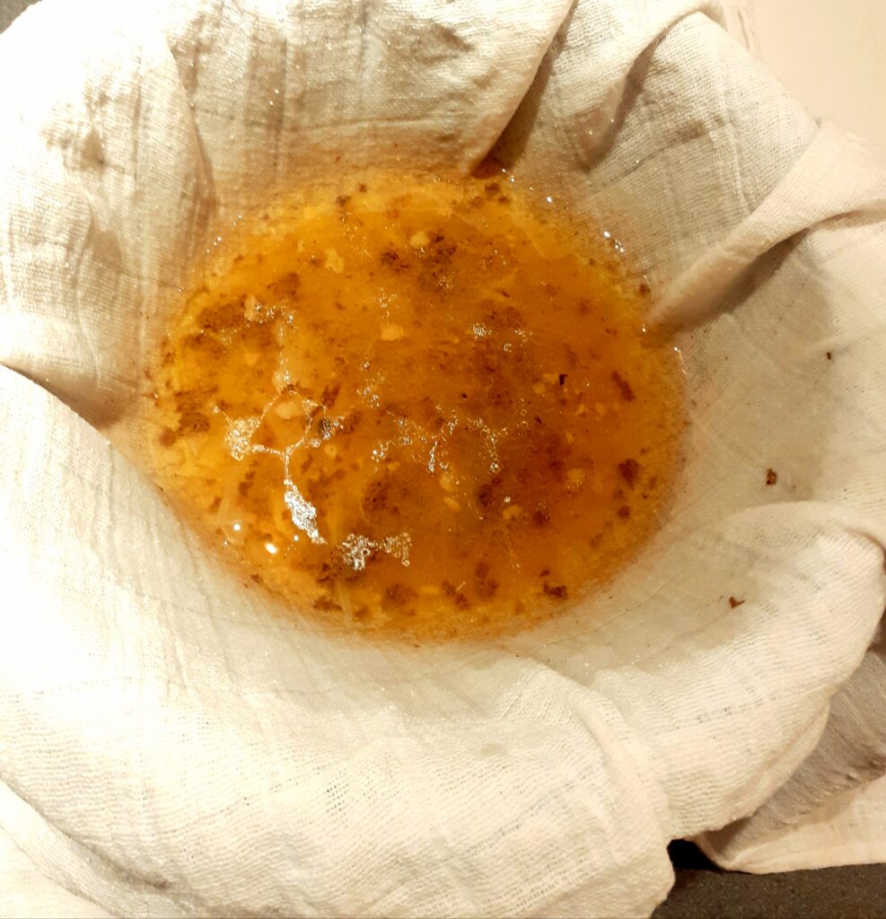 - Suppen sies igennem et klæde. Vask gryden og hælde den siede suppe tilbage. Suppen skal nu køles helt af, helst i køleskab hvis gryden kan være der.