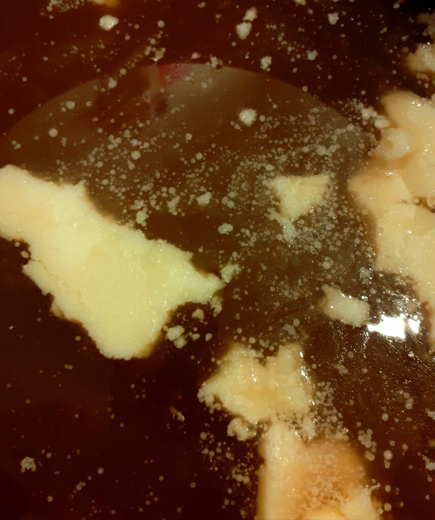 - Nu skal sovsen gøres klar. Smelt 100 g af suppefedtet i en stor gryde.