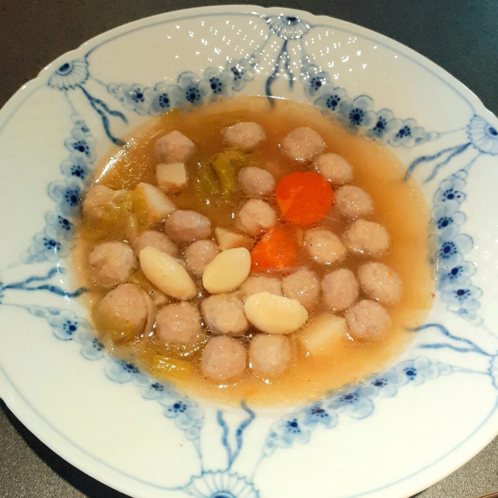 - Tænd for suppen på fuld varme og kom grøntsagerne og bollerne i. Suppen skal varmes op til ca 90 grader, den må ALDRIG koge for så opløses bollerne og det bliver uklart og grimt.