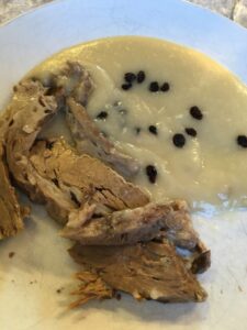 - Efter suppen er spist serveres det lune oksebryst med sovs og kartofler samt brød og/eller flutes. Korenderne kommes i sovseskålen ved servering. Kommer du dem i før svulmer de op og bliver lidt slatne.