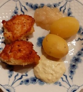 Server frikadellerne med det samme med kartofler og æblepeberrod. Jeg plejer også altid at servere remoulade til, jeg rører 1 dl remoulade op med 2 ss mælk så det bliver lidt tyndere i konsistensen.