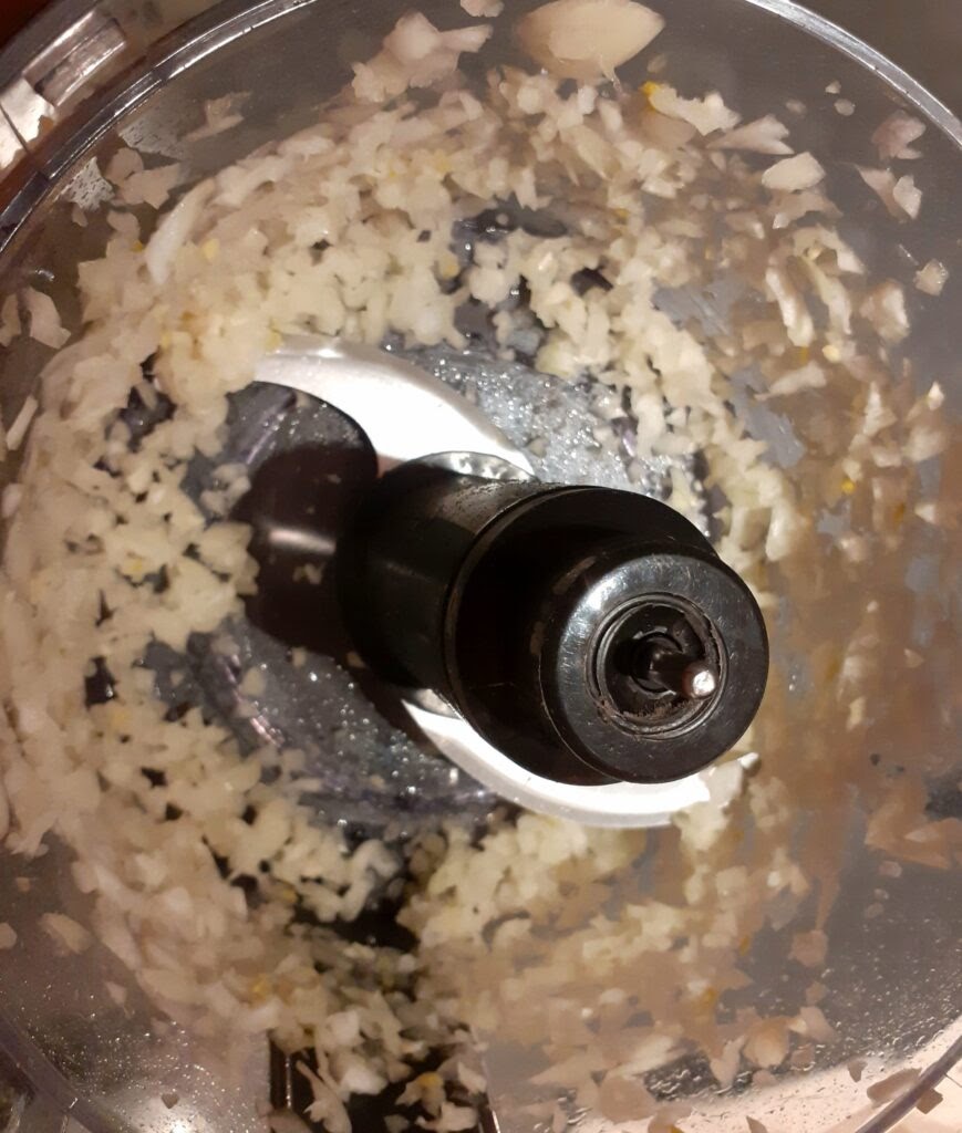 - Hak løget meget fint, jeg bruger min foodprocessor med kniv i.