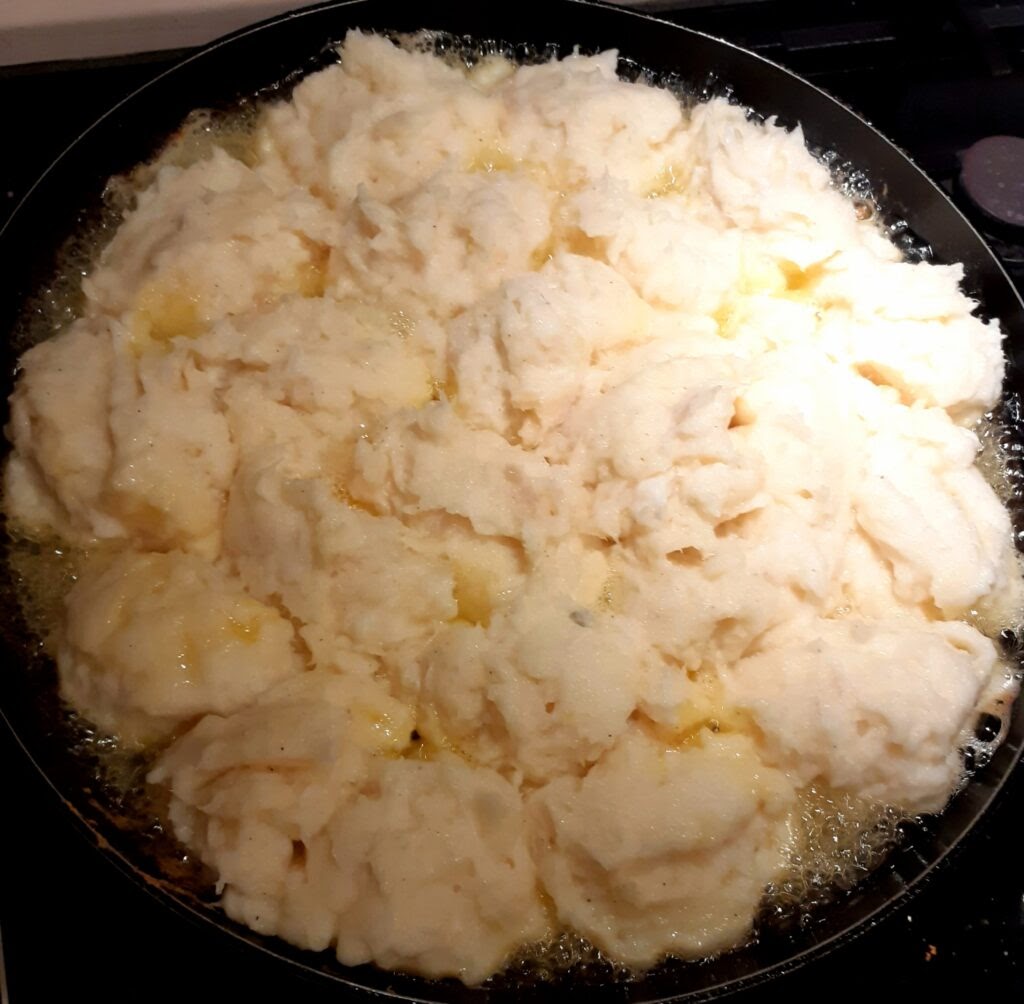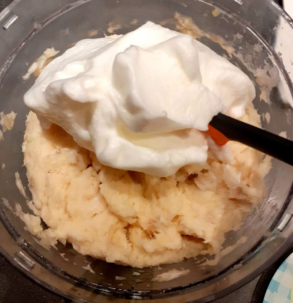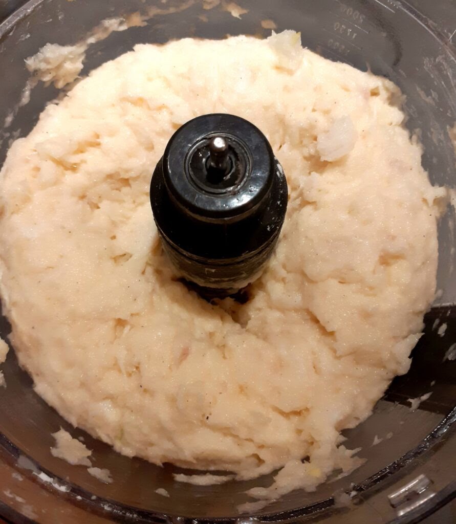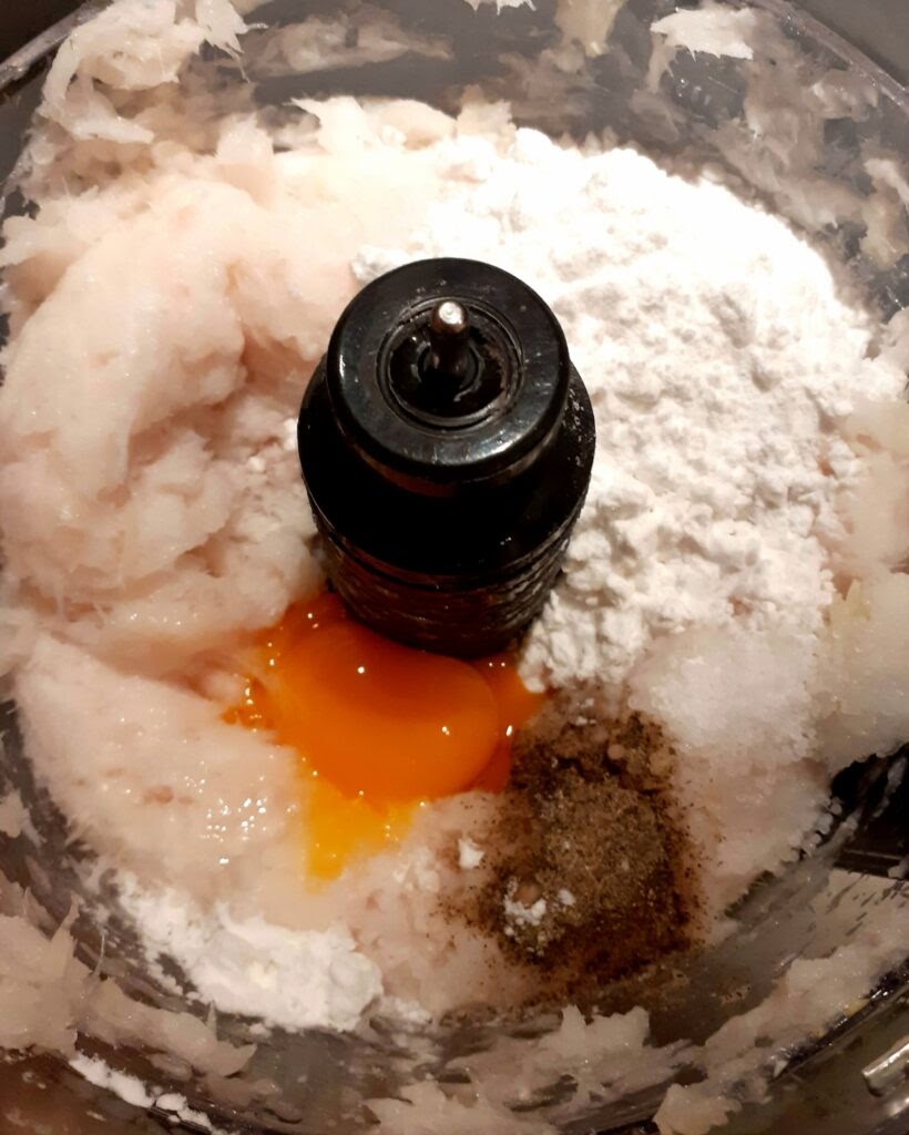 - Tilsæt kartoffelmel, æggeblommer og salt og peber, og kør igen til det har en passende konsistens, ellr tilsæt det i skålen og rør farsen grundigt sammen.