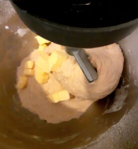 - Tilsæt koldt smør i tern, og lad røremaskinen køre på laveste hastighed i 10 min
