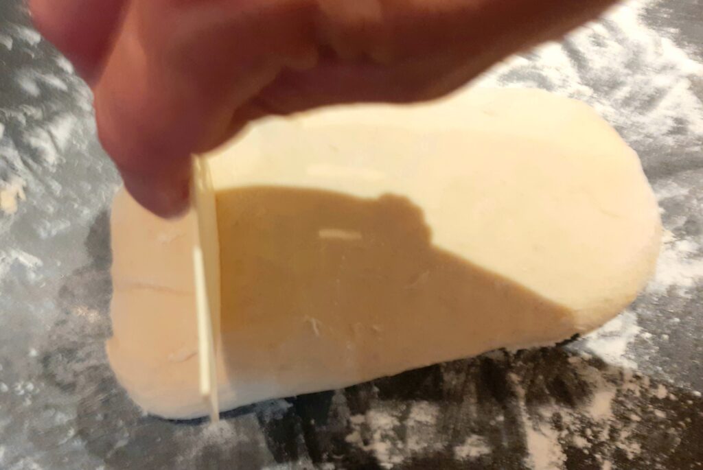 - Hvert pølsebrød skæres nu med en dejskraber ud i 6 brød, som lægges på en bageplade med bagepapir.